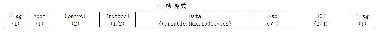- Data: 信息字段,即PPP帧的负载(如LCP帧、NCP帧).信息域缺省时最大长度不能超过1500字节,其中包括填充域的内容。