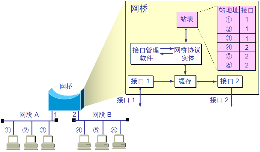 在数据链路层扩展局域网。网桥工作在数据链路层,它根据 MAC 帧的目的地址对收到的帧进行转发。网桥具有过滤帧的功能。当网桥收到一个帧时,并不是向所有的接口转发此帧,而是先检查此帧的目的 MAC 地址,然后再确定将该帧转发到哪一个接口